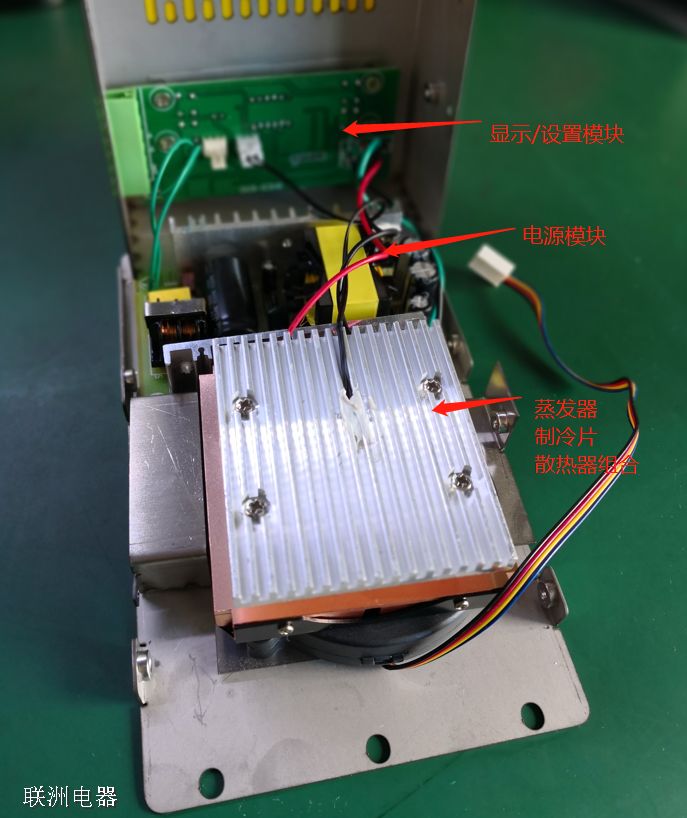 由風(fēng)扇將含濕量較大的空氣吸入除濕裝置內(nèi),在流經(jīng)低溫的蒸發(fā)器時,空氣中的一部分水蒸氣在蒸發(fā)器表面凝結(jié)成水珠析出。在蒸發(fā)器下部設(shè)有集水盤,將冷凝水收集起來流入排水管并向室外排出。蒸發(fā)器一般是像散熱器一樣的鋁板,下部緊貼半導(dǎo)體制冷片,制冷片工作時會將蒸發(fā)器的熱量吸走,從而使其溫度降低。與制冷片連接的是散熱專用的散熱器和風(fēng)扇。