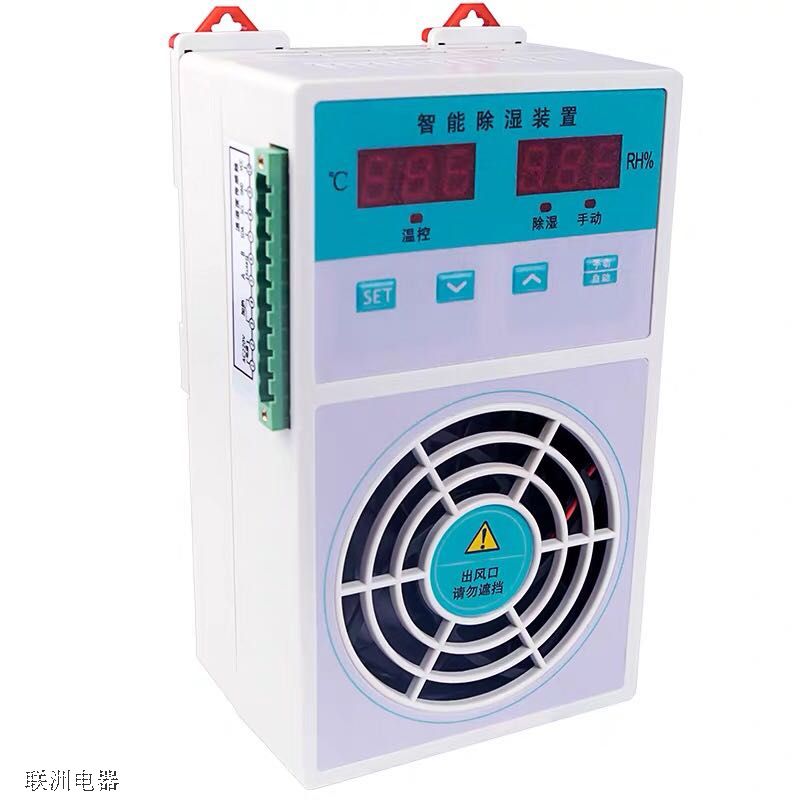 開關(guān)柜除濕機(jī) 當(dāng)潮濕空氣經(jīng)風(fēng)扇吸入后,通過特殊設(shè)計(jì)的風(fēng)道流動(dòng),先經(jīng)半導(dǎo)體制冷器件降溫結(jié)露,制冷器的結(jié)露在重力作用下滴入引水槽,再由導(dǎo)水管流出柜外。在設(shè)定啟動(dòng)值內(nèi)經(jīng)過充分循環(huán)除濕,使柜內(nèi)空氣濕度降至結(jié)露點(diǎn)以下,完成整個(gè)防潮引凝加熱過程。同時(shí),智能型抽濕裝置信號(hào)采集傳感器外置,能實(shí)時(shí)準(zhǔn)確的采集到柜內(nèi)的真實(shí)濕度,保證智能型抽濕裝置在柜內(nèi)將要達(dá)到凝露條件時(shí)提前啟動(dòng)除濕。當(dāng)箱體溫度低于設(shè)定的啟動(dòng)值時(shí),抽濕裝置啟動(dòng)內(nèi)部加熱器回路(外接加熱器,功率可接50~500W),直到箱體內(nèi)溫度升高到設(shè)定啟動(dòng)值加回差溫度(5℃)時(shí),加熱器回路停止工作。冷凝片損壞或不工作,故障報(bào)警輸出,傳感器損壞或不工作,故障報(bào)警輸出。