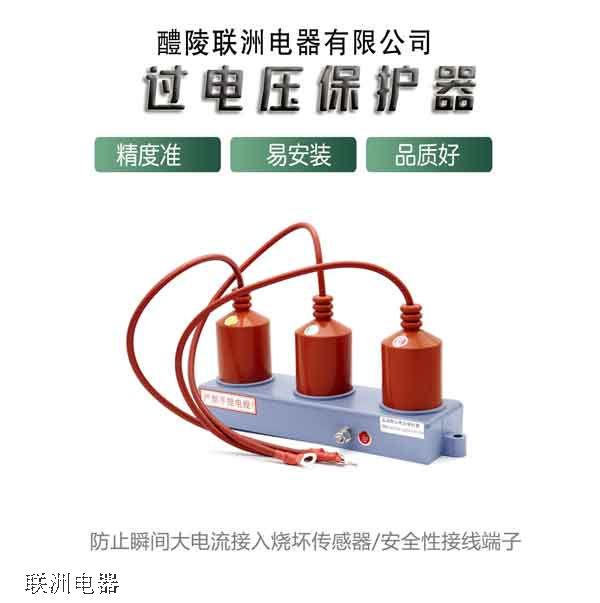 三相組合過電壓保護器分別由四只保護單元組成(即三只相單元及一只地單元)。使用時,三只相單元通過高壓電纜分別接在電力系統被保護設備對應B,C三相相線上,地單元的接地端接地,其中相單元的任意兩個單元組成相間保護的保護器。而相單元的任意一單元與地單元可組成相對地保護的保護器。這樣,被保護設備的相間和相對地都可得到有效保護。
